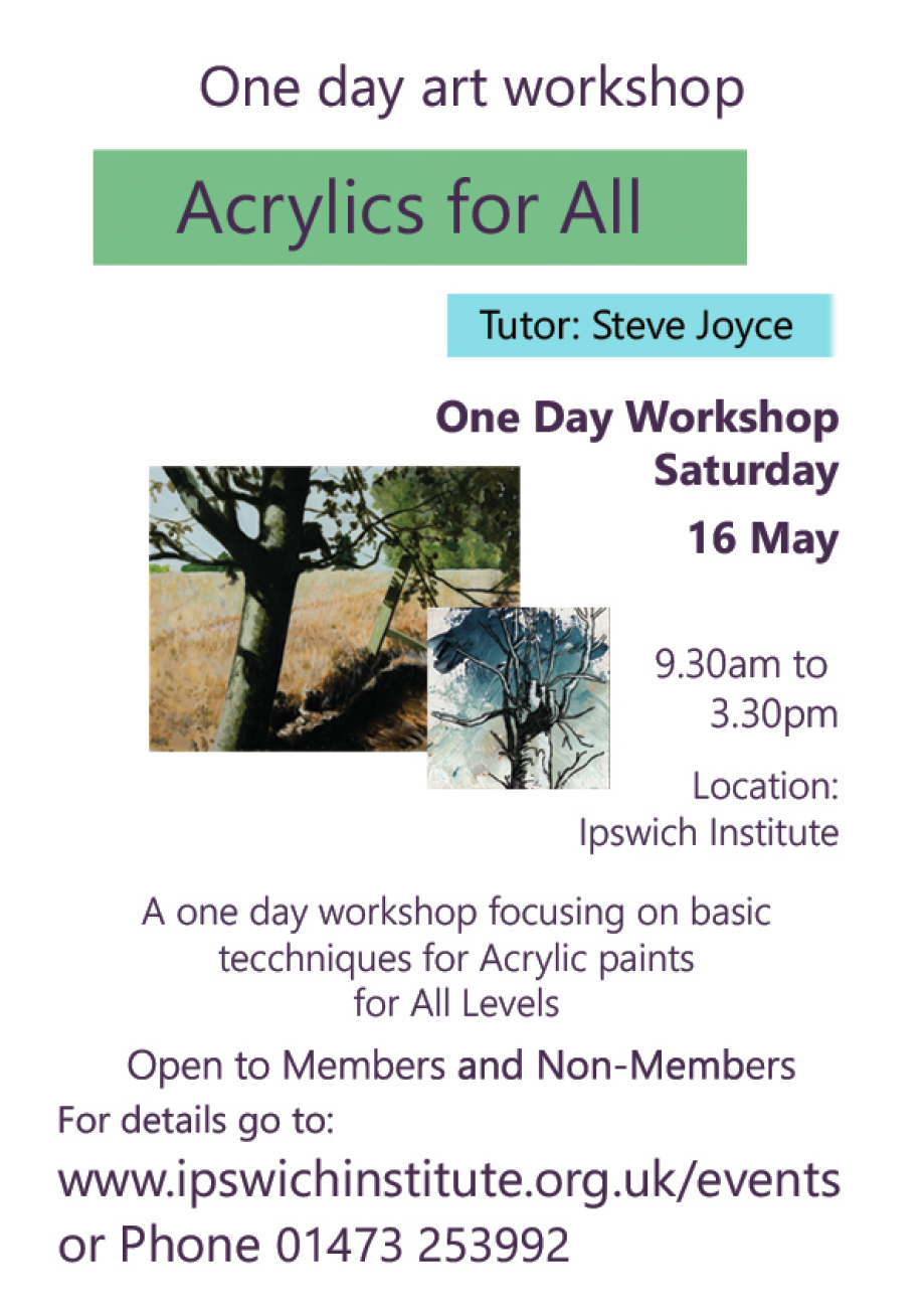This workshop for any level of experience, introduces key techniques and skills relating to the use of acrylic paints. There will be some aspects of colour mixing covered, along with sequencing the application and manipulation of the brushstrokes for different effects. There will be examples and demonstrations to guide you and options to follow your own focus. You can bring your own source material to work from or use those provided.